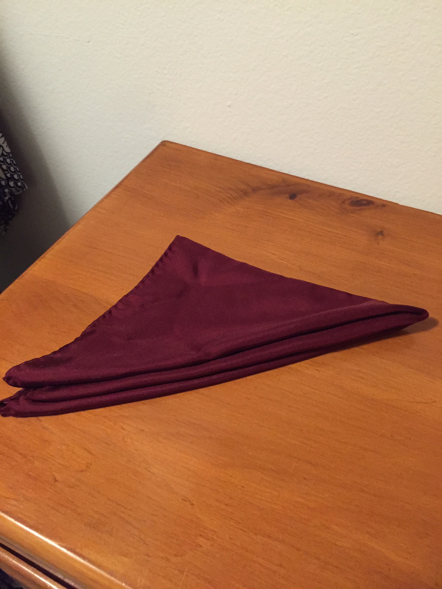 7. Pull apart the three folds of fabric from one another, making three separate and distinct peaks. Pull “up” the middle fold to make this the more prominent peak. If you want to make it crisp, now is the time to get out the iron. Keep the iron temp low if you’re using a silk pocket square.