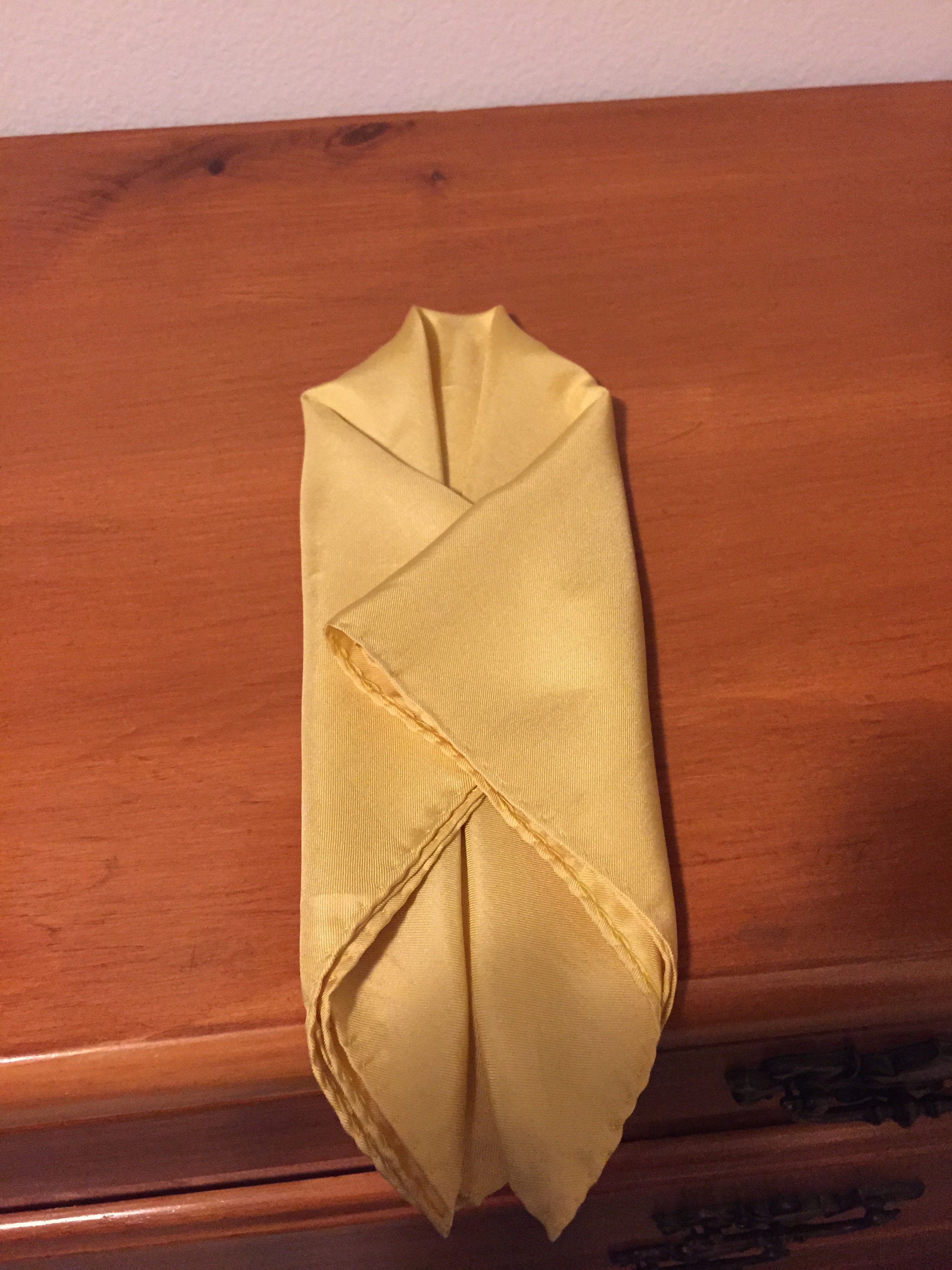 Today’s fold is a fairly simple, but versatile one. The Winged Puff. It tends to be more formal, but can be worn somewhat dressed down as well. It is also very simple to do, and can be done with nearly any fabric or size of pocket square.