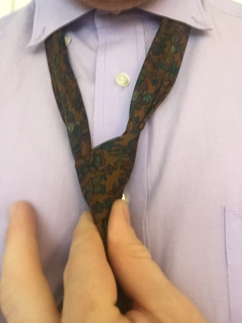 At this point, you place your finger into the tie hole like so below. It doesn’t matter what knot you’re tying, whether it be four in hand, a full- or half-windsor, it works for all. As you pull down with your finger, imagine that you’re making an “M” with the fabric of your tie.